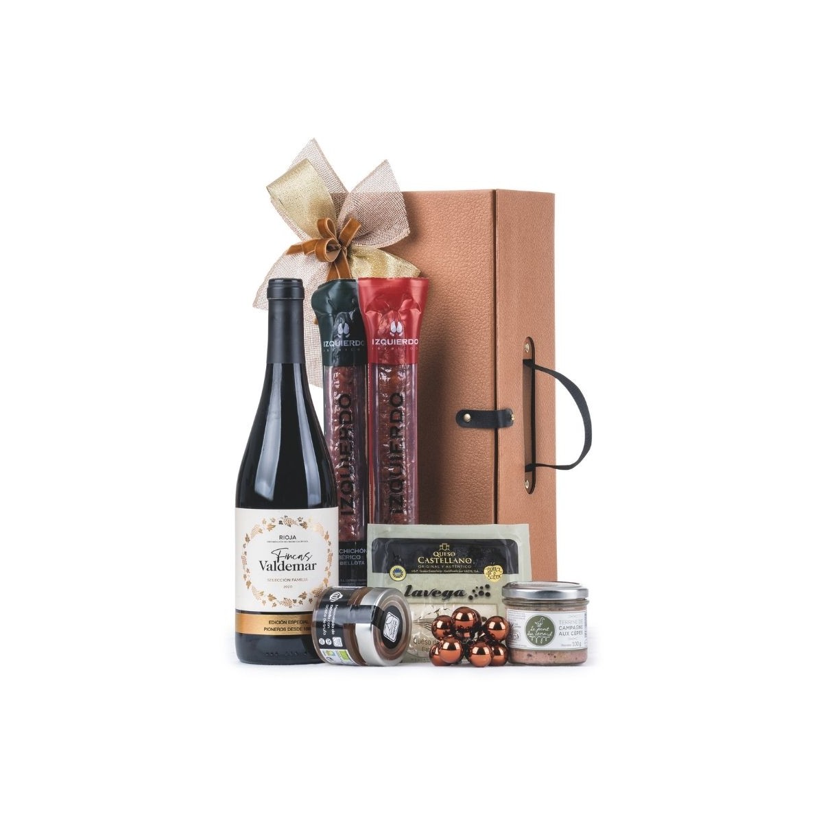 Pequeño detalle de Navidad con vino de la Rioja, queso 100% oveja. El embutido y el mousse son los acompañantes perfectos para servirlo y disfrutar de un gran momento.