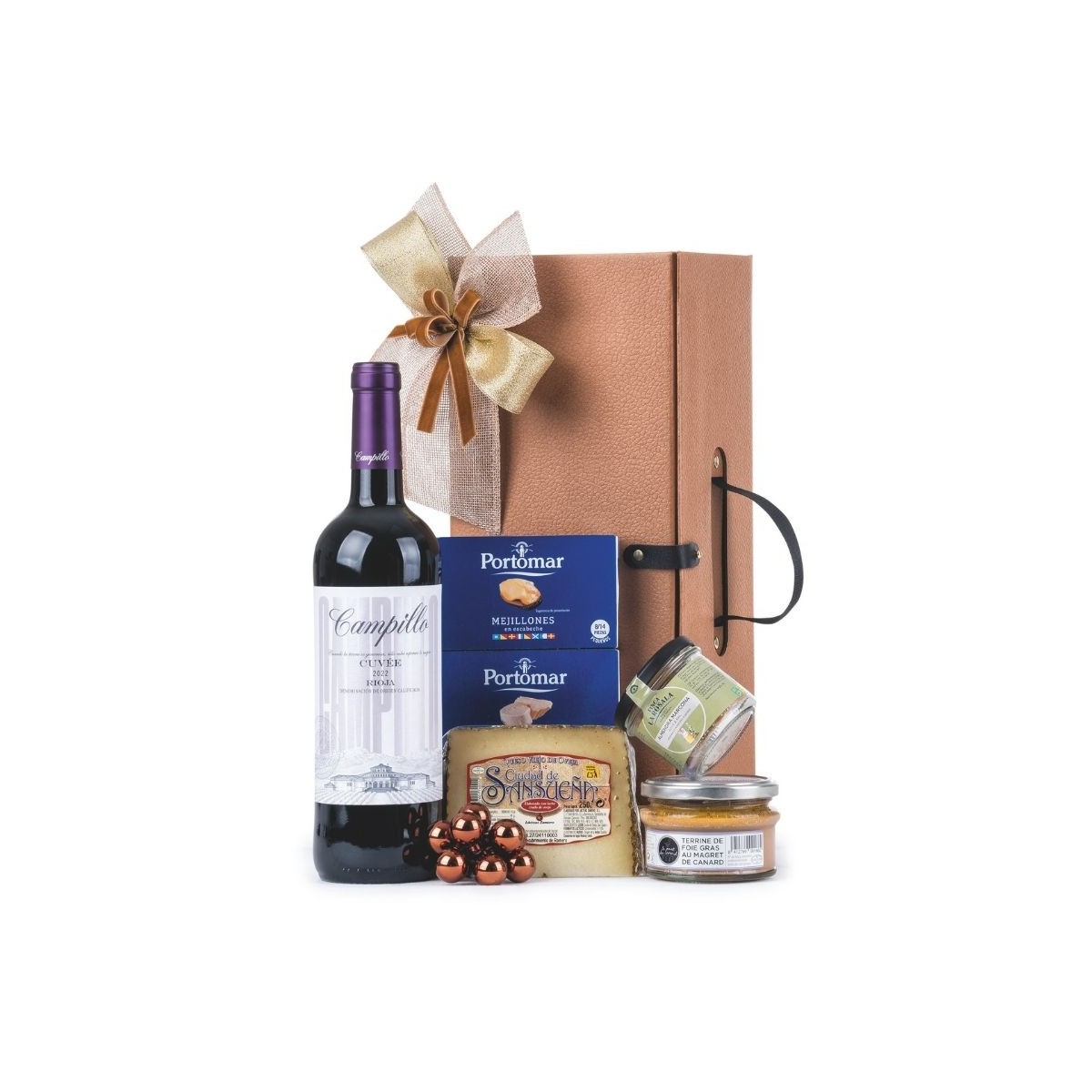 Elegante Lote de Navidad con el que sorprender con un buen vino Rioja y, para acompañar, un gran queso de oveja teniendo como contrapunto mejillones y bonito de norte Portomar. Quedar bien en Navidad es muy fácil con este detalle.