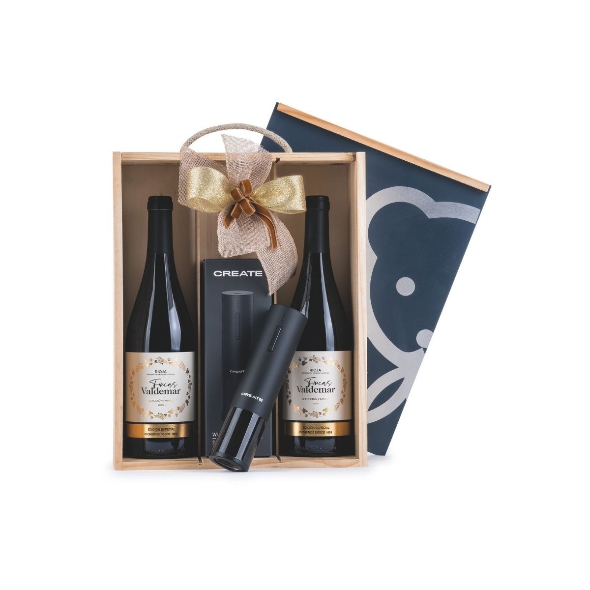 Caja de Navidad con dos botellas de vino tinto y un sacacorchos eléctrico de la marca Create. Un regalo con el que sorprender a los amantes del vino.