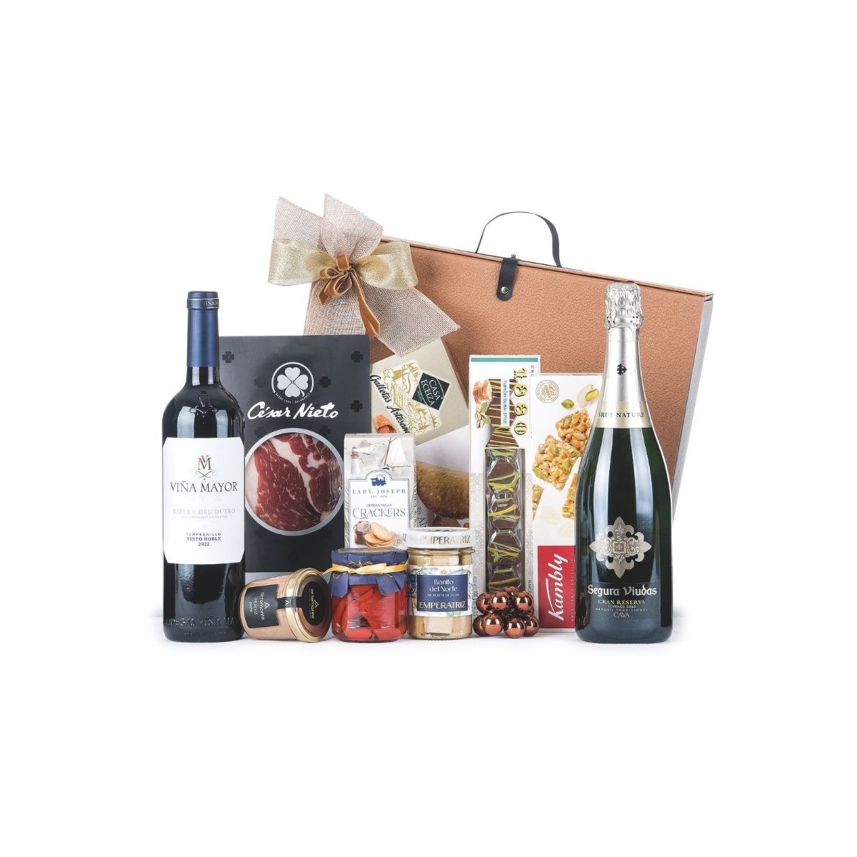 Exquisito detalle para obsequiar estas Navidades con productos selectos. Cava Brut Nature Segura Viudas, vino tinto Ribera del Duero, con un surtido amplio de productos delicatessen que componen este especial Lote de Navidad.