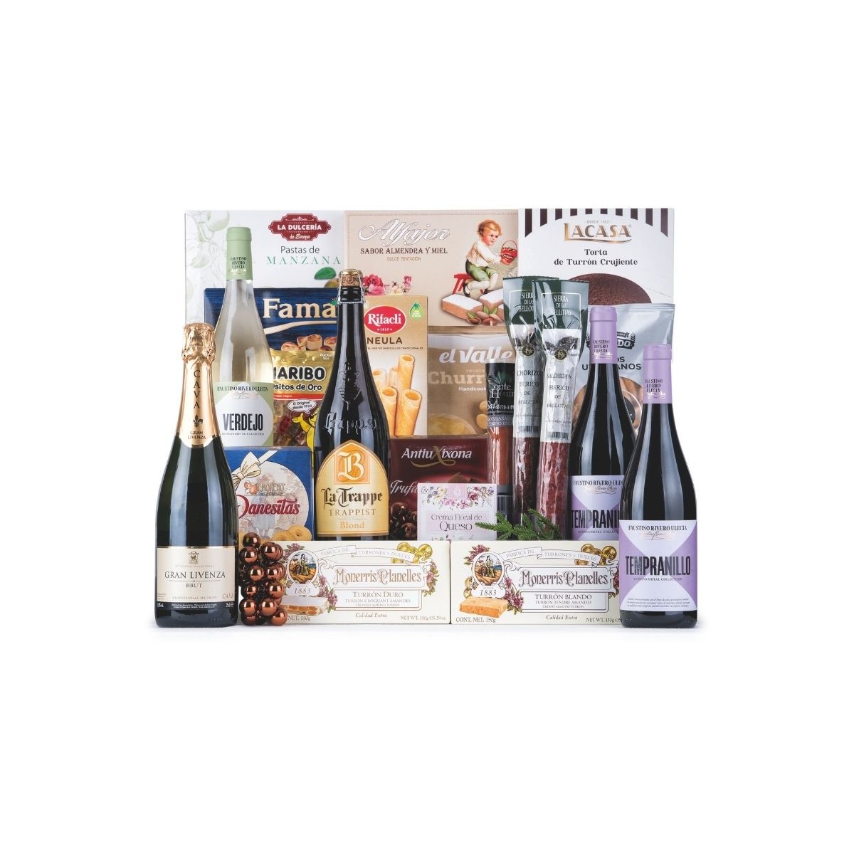 Lote de Navidad surtido con una amplia gama de productos de primera calidad. En esta caja destacamos el cava brut, la ginebra y la variedad de estuches de dulces tradicionales, que no pueden faltar en ninguna mesa estas Navidades. No te dejes a nadie por invitar estas Navidades.