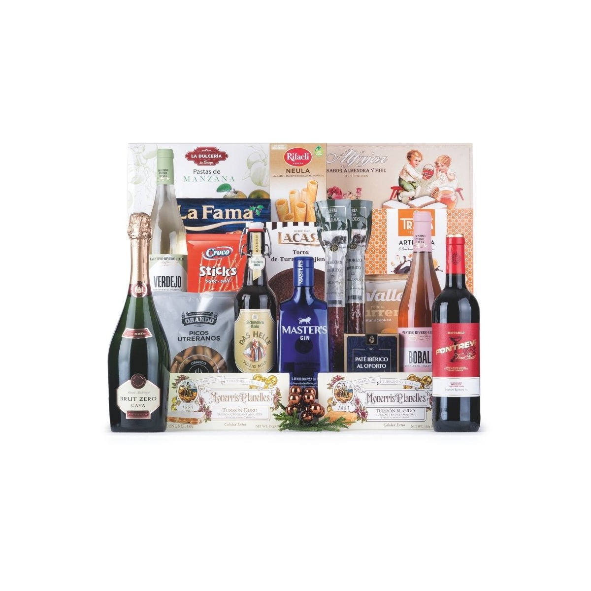 Cesta de Navidad tradicional donde destacamos la variedad en bebidas, entre ellas la ginebra Master's, los embutidos ibéricos y los dulces tradicionales, donde no pueden faltar un buen turrón y los polvorones, entre muchos otros. Un regalo de Navidad para toda la familia.