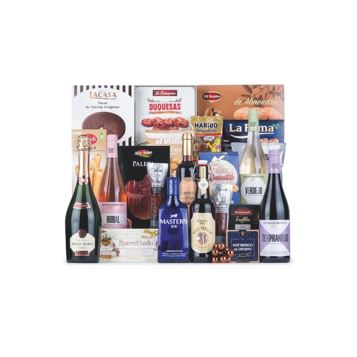 Cesta de Navidad con un exquisito surtido de productos compuesta, por siete botellas entre las que destacamos la ginebra Master´s, una variedad de productos ibéricos y los dulces tradicionales para que puedas disfrutar en la sobremesa con tus amistades. Disfruta estas Navidades con los tuyos.