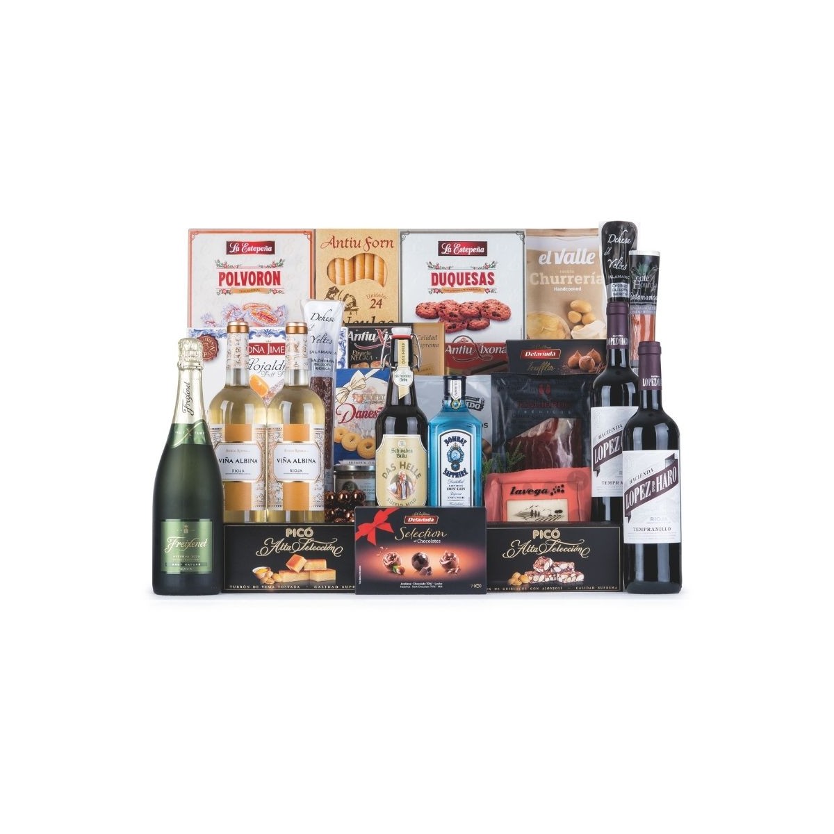 Cesta de Navidad con una selección de cavas, vinos, cerveza y ginebra, donde destaca la variedad de dulces tradicionales y la selección de ibéricos. Esta cesta de Navidad es tan completa que no te hará falta nada más para tus celebraciones navideñas.