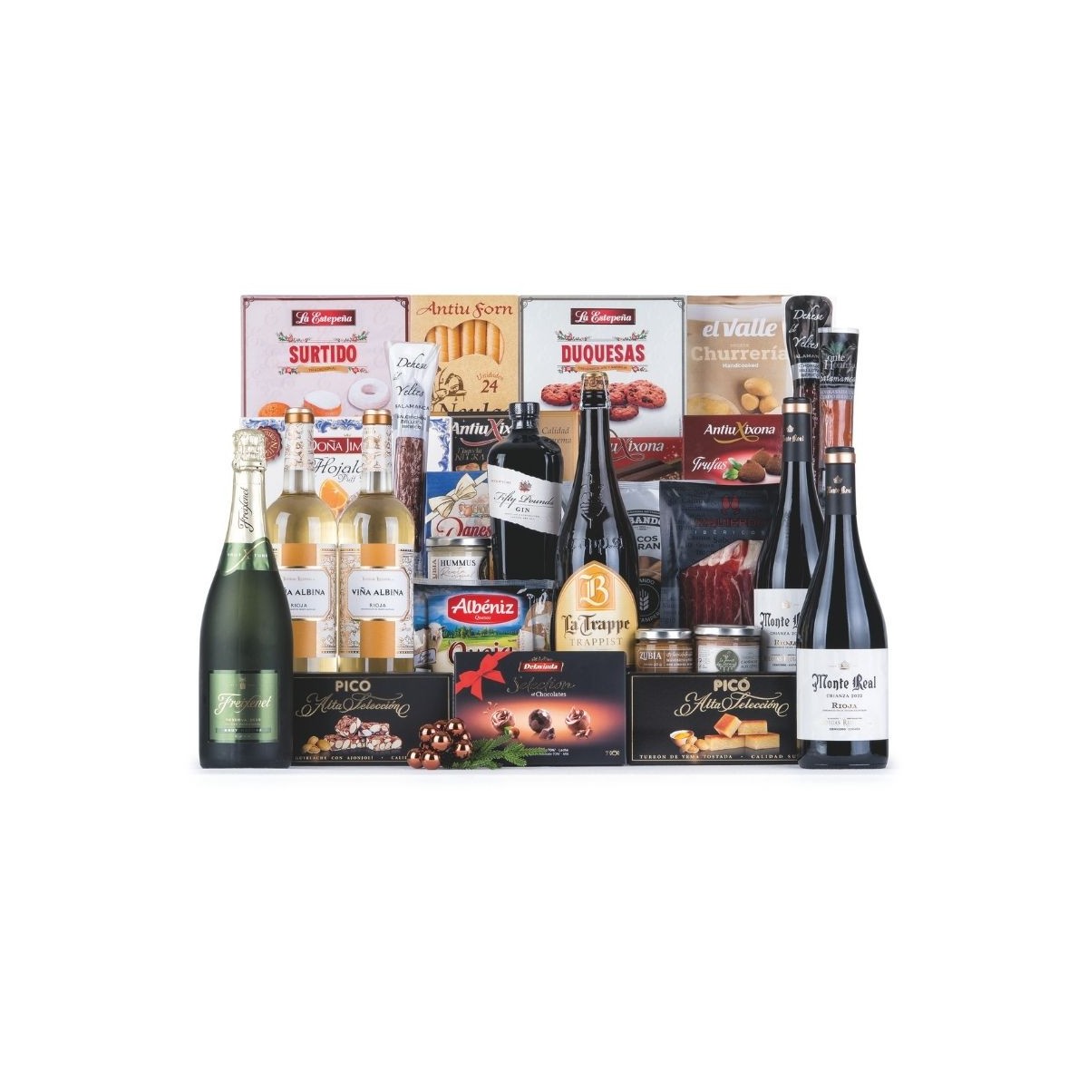 Cesta de Navidad que destaca por el exquisito surtido de productos y la calidad de sus marcas. Tendrás todo lo necesario para disfrutar de las Navidades, desde la ginebra Fifty Pounds, pasando por la amplia gama de dulces tradicionales y los embutidos ibéricos. Un gran detalle navideño.