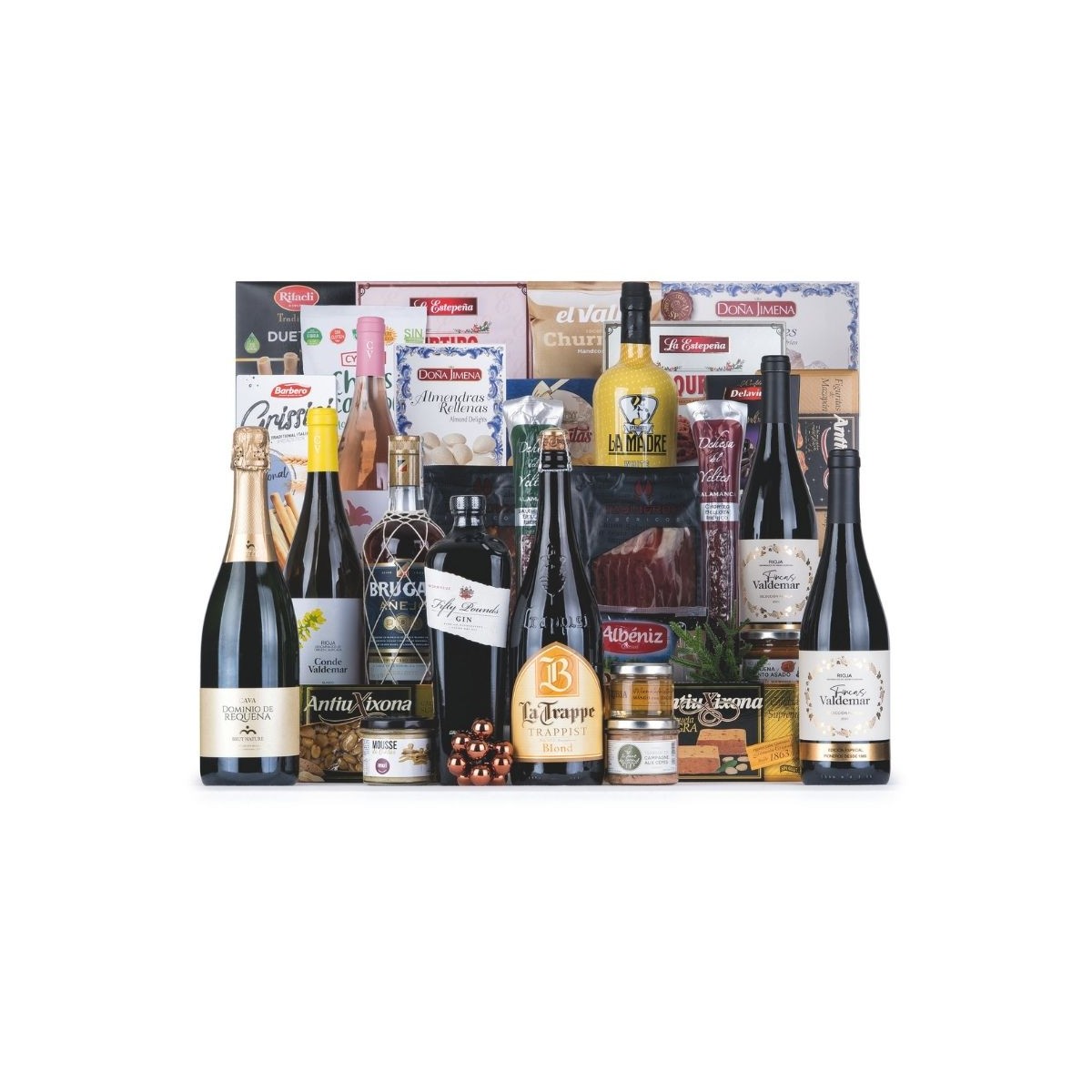 En esta caja de Navidad encontrarás todo lo que necesitas, y más, para estas Navidades. La calidad de los productos que la componen y la variedad de los mismos hacen de este un obsequio perfecto. Vermouth, ron, ginebra, vinos, cava, queso de oveja, embutidos ibéricos y los dulces tradicionales más variados componen este lote de Navidad.