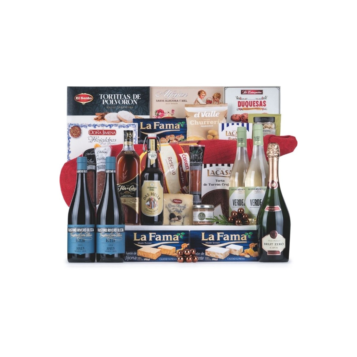 Lote de Navidad con un excepcional Jamón Serrano Gallego Coren y la mejor variedad de productos para celebrar estas Navidades en familia. Destacamos el ron, cerveza, la selección de dulces tradicionales como los polvorones y los hojaldres, y el embutido ibérico. Un obsequio perfecto para cualquier celebración navideña.