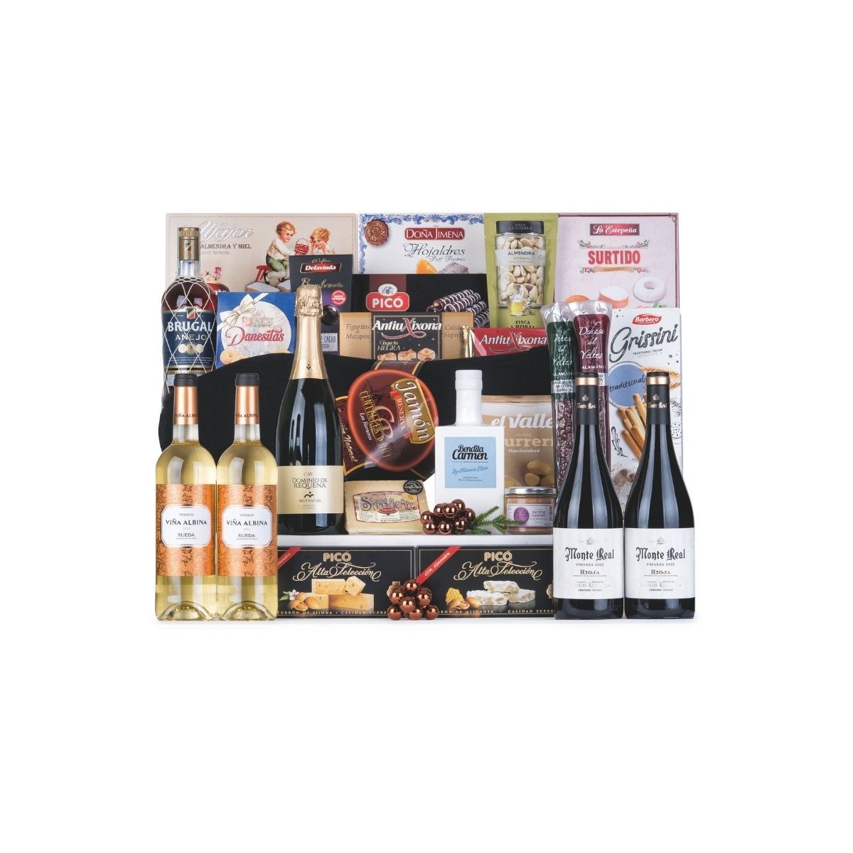 Lote de Navidad con Jamón Reserva de Huelva. Esta cesta está surtida con productos de primeras marcas donde no puede faltar ron y ginebra, vinos D.O. Rioja, cava brut nature, embutidos ibéricos y la mejor variedad de dulces tradicionales. Un regalo de Navidad sin duda exquisito.