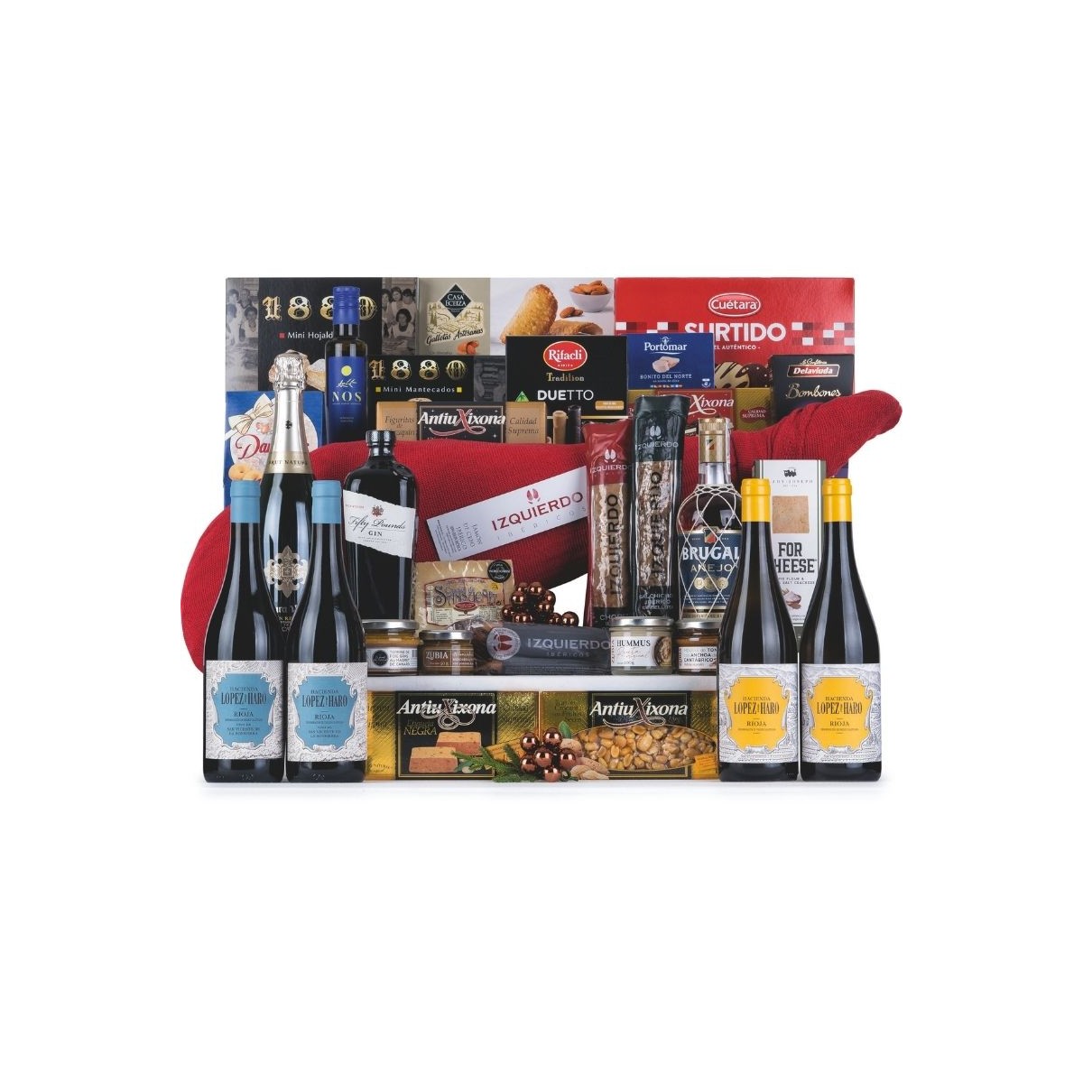 Lote de Navidad con amplia variedad de productos. Desde el Jamón Cebo Ibérico Izquierdo que es el producto a destacar en este lote, pasando por el ron, la ginebra, vinos de la mejores marcas, entre otras muchas bebidas. Y no podían faltar los embutidos ibéricos de bellota ni los dulces tradicionales de Navidad. Toda una delicia para obsequiar estas Navidades.