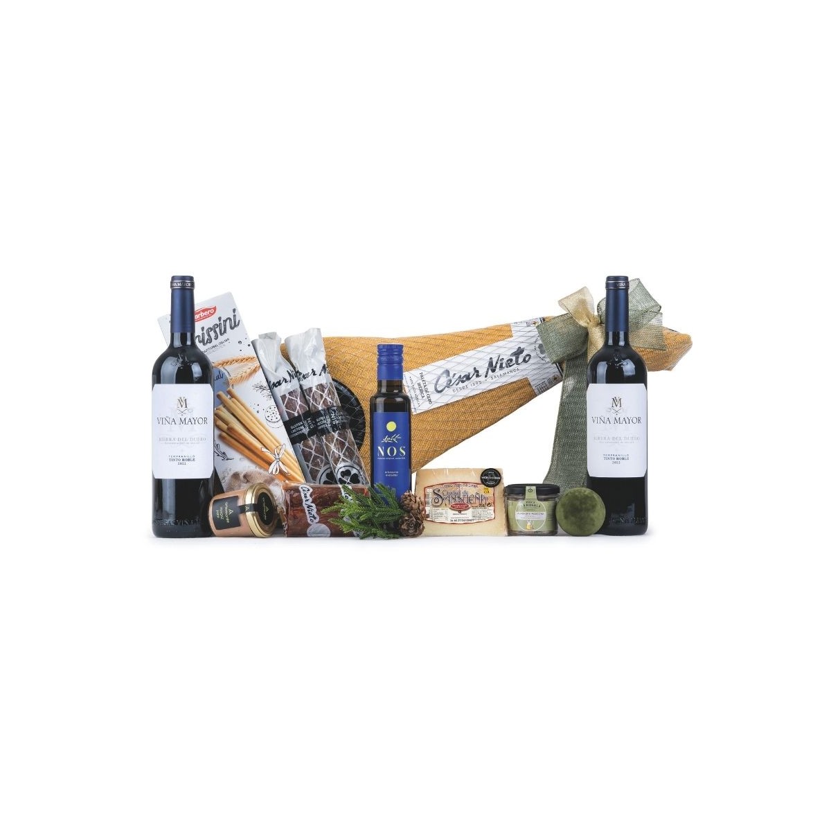 Cesta de Navidad en la que destacamos la Paleta de Cebo 50% Ibérica César Nieto, embutidos ibéricos: chorizo, salchichón y lomo, queso de oveja, paté, aceite de oliva virgen extra, grissini y dos botellas de vino Ribera del Duero. Un obsequio perfecto para celebrar la Navidad en buena compañía.