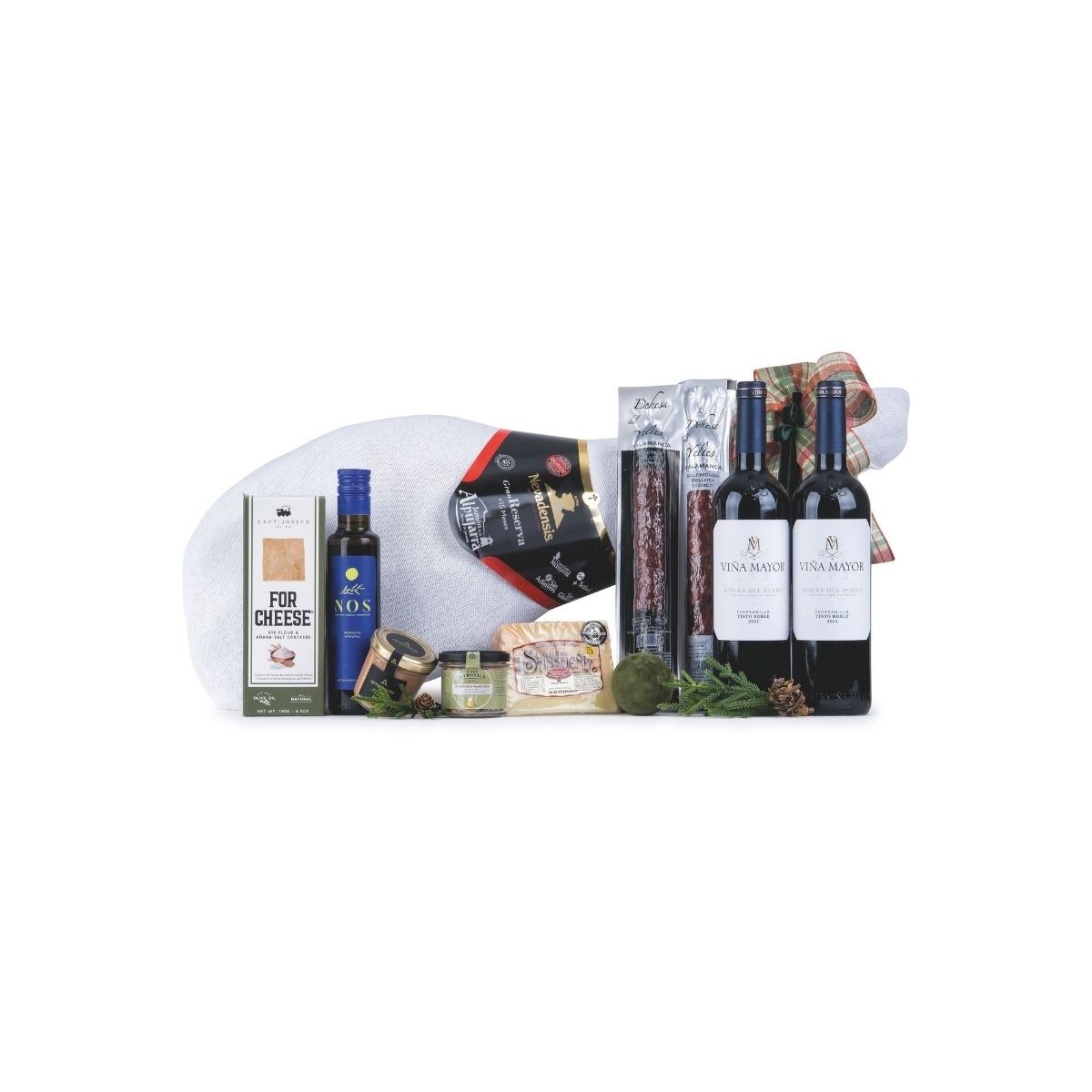 Cesta de Navidad presidida por un Jamón Gran Reserva de la Alpujarra "V" de Nevadensis, embutidos ibéricos de bellota, un queso de oveja, aceite de oliva, crackers y dos botellas de vino tinto D.O. Rioja.