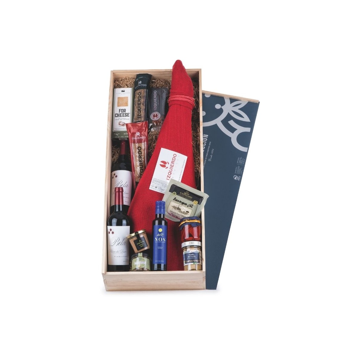 Selecta caja de Navidad, compuesta por un Jamón Ibérico de cebo 50% Izquierdo Salamanca, dos piezas de embutidos ibéricos de bellota, queso de oveja, un lomo ibérico, una botella de aceite de oliva y dos botellas de vino crianza D.O. Ribera del Duero. Uno de los mejores lotes de Navidad de nuestro catálogo.