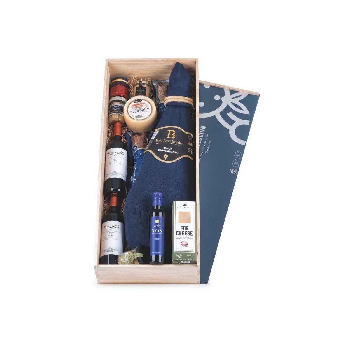 Esta cesta de Navidad se distingue por la excelencia de cada uno de sus productos, comenzando con un Jamón Etiqueta Negra de Guijuelo, de más de 7 kg, que garantiza un sabor y curación excepcionales. Acompañando a este jamón premium, se incluyen ibéricos de bellota como el salchichón y el chorizo cular. El queso de oveja tradicional Albeniz y el paté de jabalí completan la oferta gourmet de esta cesta. Para acompañar, dos botellas de vino tinto Campillo Crianza, perfectas para maridar, junto a productos delicatessen como el aceite de oliva virgen extra, el bonito del norte y las almendras Marcona. Todo ello presentado en una caja jamonera de madera con certificado PEFC, que añade un toque de elegancia y sostenibilidad a esta selección inigualable.
