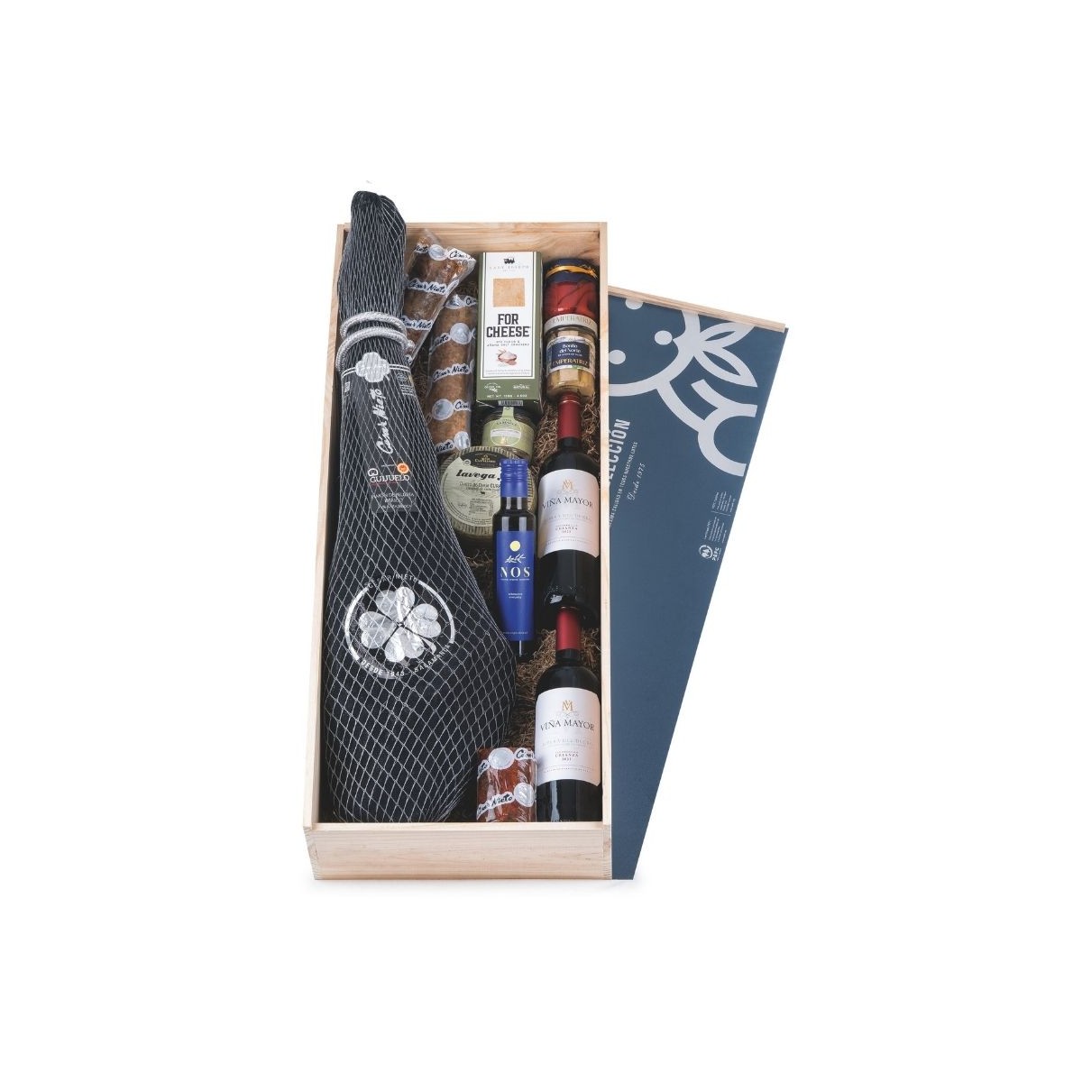Caja de Navidad con una exquisita selección de productos ibéricos. Destacamos el Jamón Ibérico de Bellota 75% Raza Ibérica César Nieto junto al lomo, salchichón y chorizo de la misma marca y calidad, un queso 100% de oveja, dos botellas de vino tinto D.O Ribera del Duero.