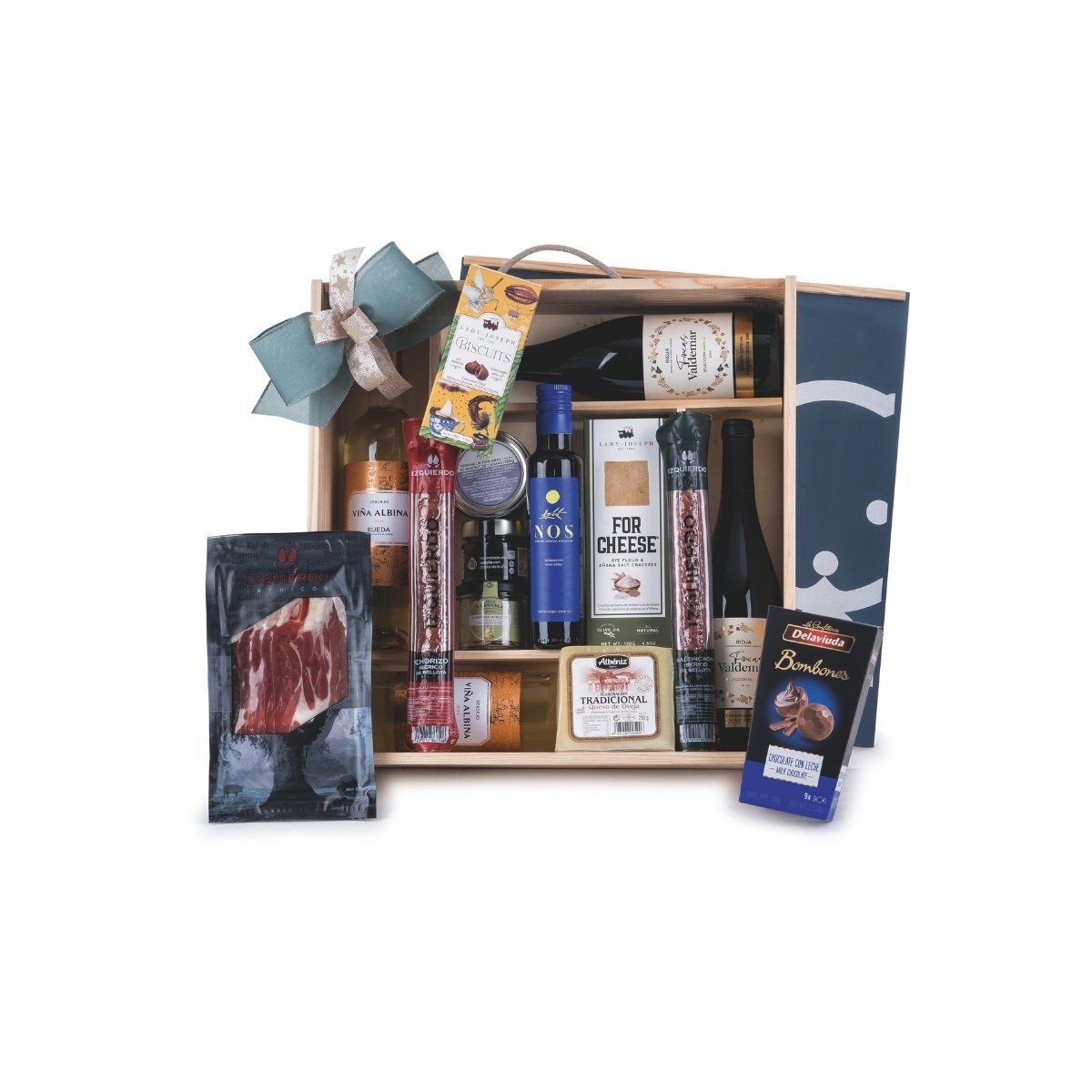 Caja de Navidad con productos selectos compuesta por 2 botellas de vino Fincas Valdemar Rioja, 2 botellas vino Viña Albina Rueda, una botella de aceite de oliva virgen extra, un queso de oveja, una variedad de embutidos ibéricos de bellota, entre otros. Encontrarás todo un surtido de productos delicatessen para acompañar un momento especial.