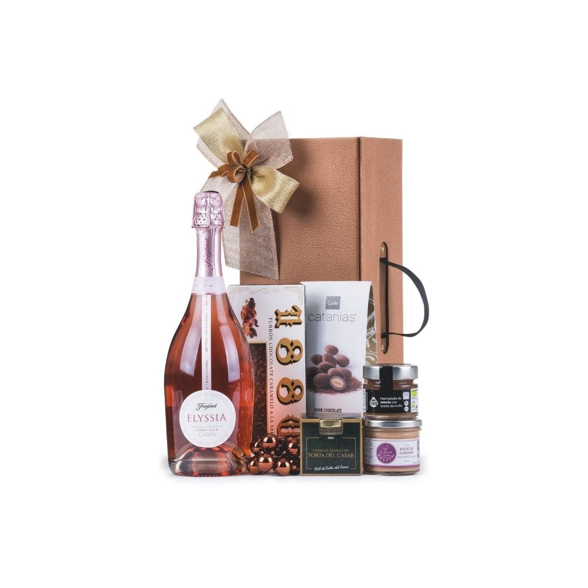Estuche regalo especial de Navidad con cava brut rosado de Freixenet, paté de pato, mermelada con aceite de trufa y una pastilla de turrón de chocolate a la sal de 1880. Un regalo con un sabor lleno de sensaciones.