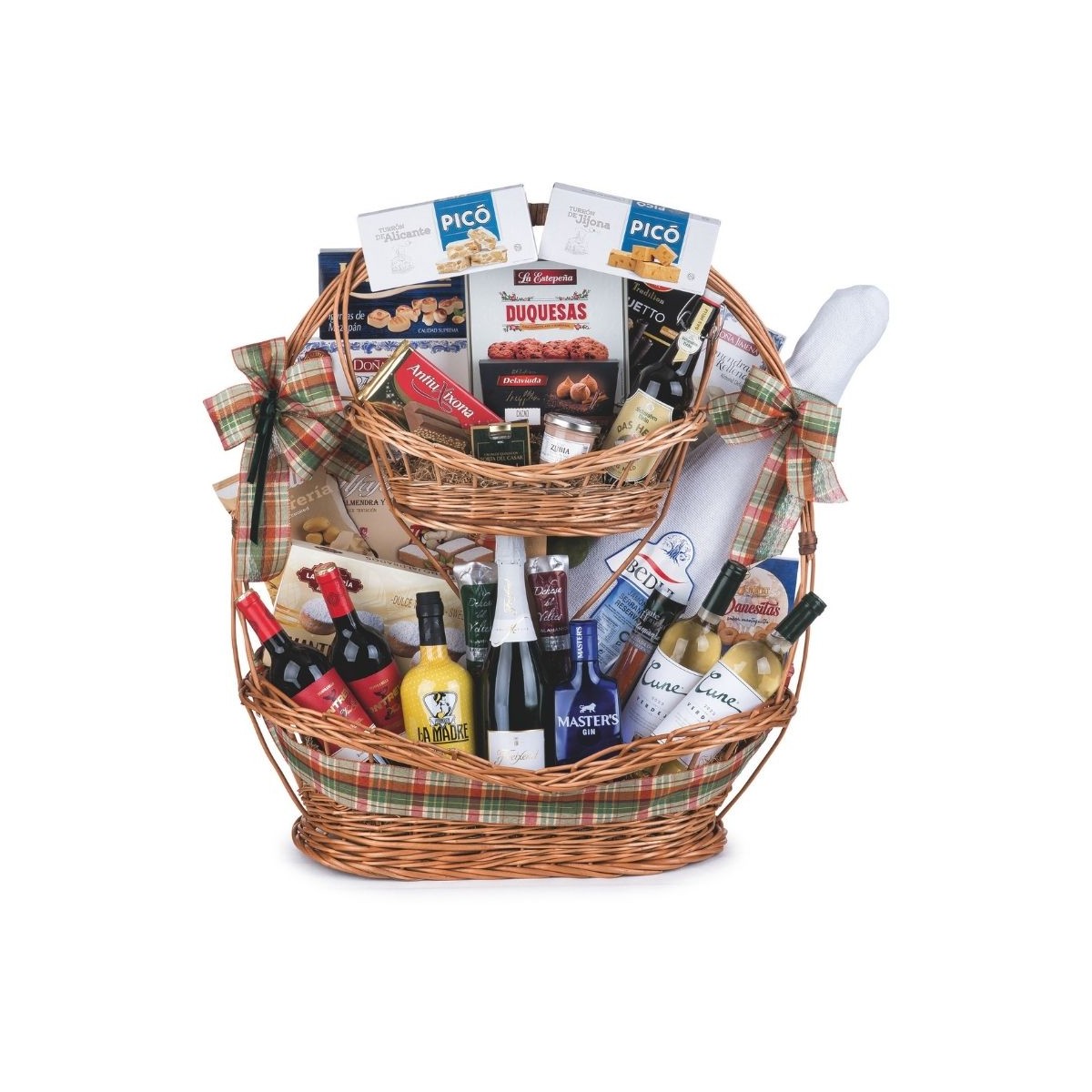 Espectacular cesta de Navidad de mimbre de dos pisos. Un regalo de navidad con el que no dejarás indiferente a nadie. Compuesta por una variedad de dulces tradicionales, licores, vinos, cavas, embutidos ibéricos de bellota, un Jamón Reserva de Los Pedroches Ibedul, entre otros productos de calidad. ¿A quién le tocará?